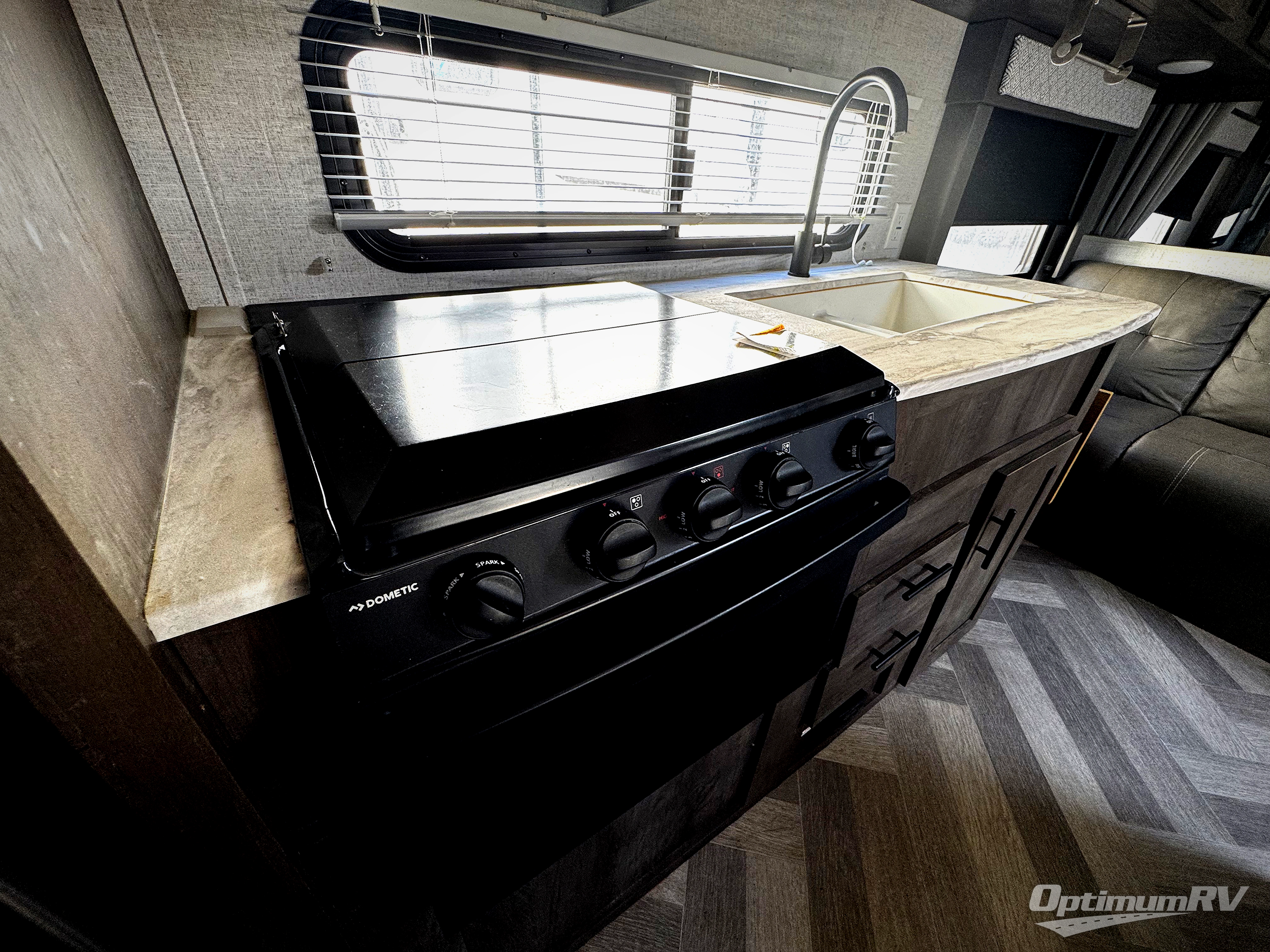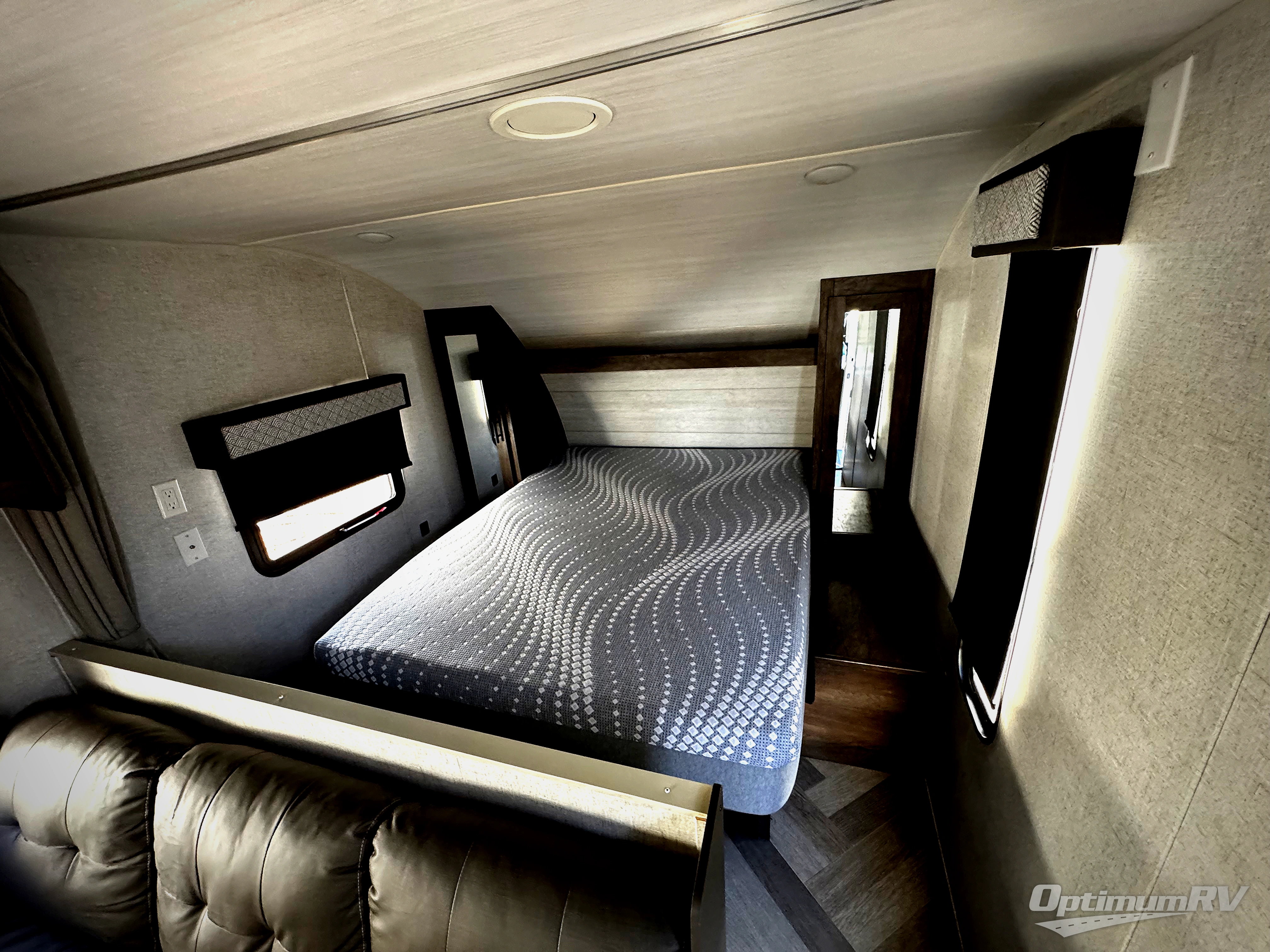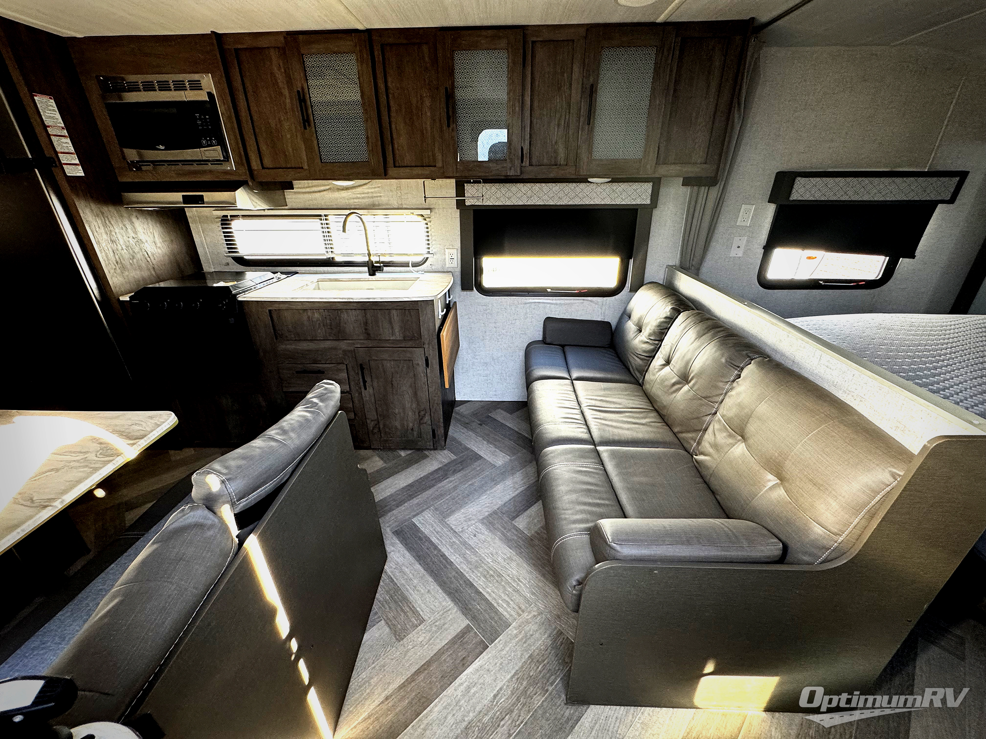 Double size bunk beds make this a fun travel trailer for the kids, so invite some friends to join them for a weekend getaway! You will have your own walk-around queen bed up front while your kids and their friends can sleep on the bunk beds, the sofa and the booth dinette after the furniture is easily set up for nighttime. Everyone will surely appreciate having access to the private toilet and shower/tub room with the bath sink just outside the door. This setup will allow someone to shower while another person is washing their face. The kitchen provides everything you will need to keep everyone fed, plus you can add the optional outside kitchen if you like.
