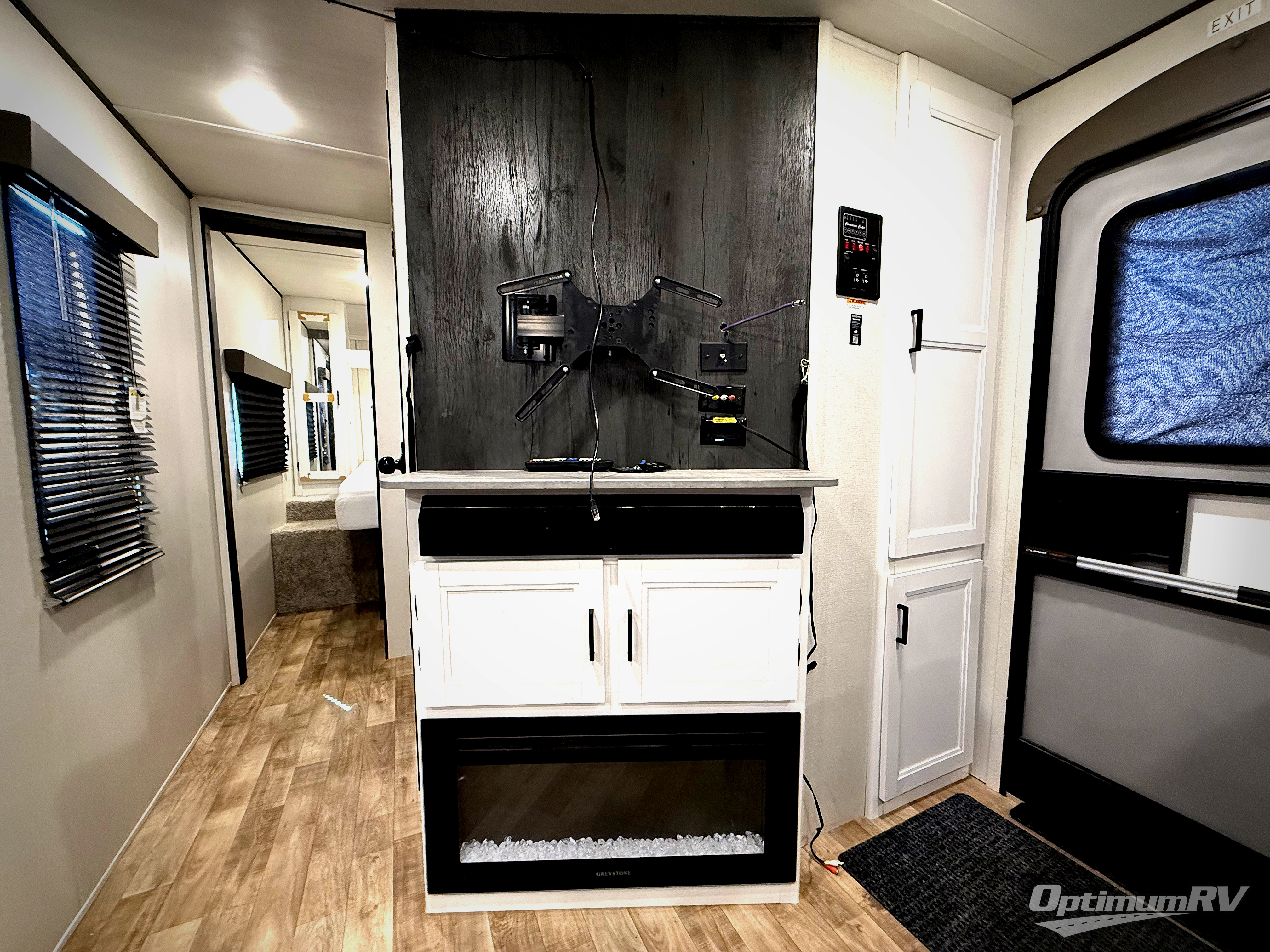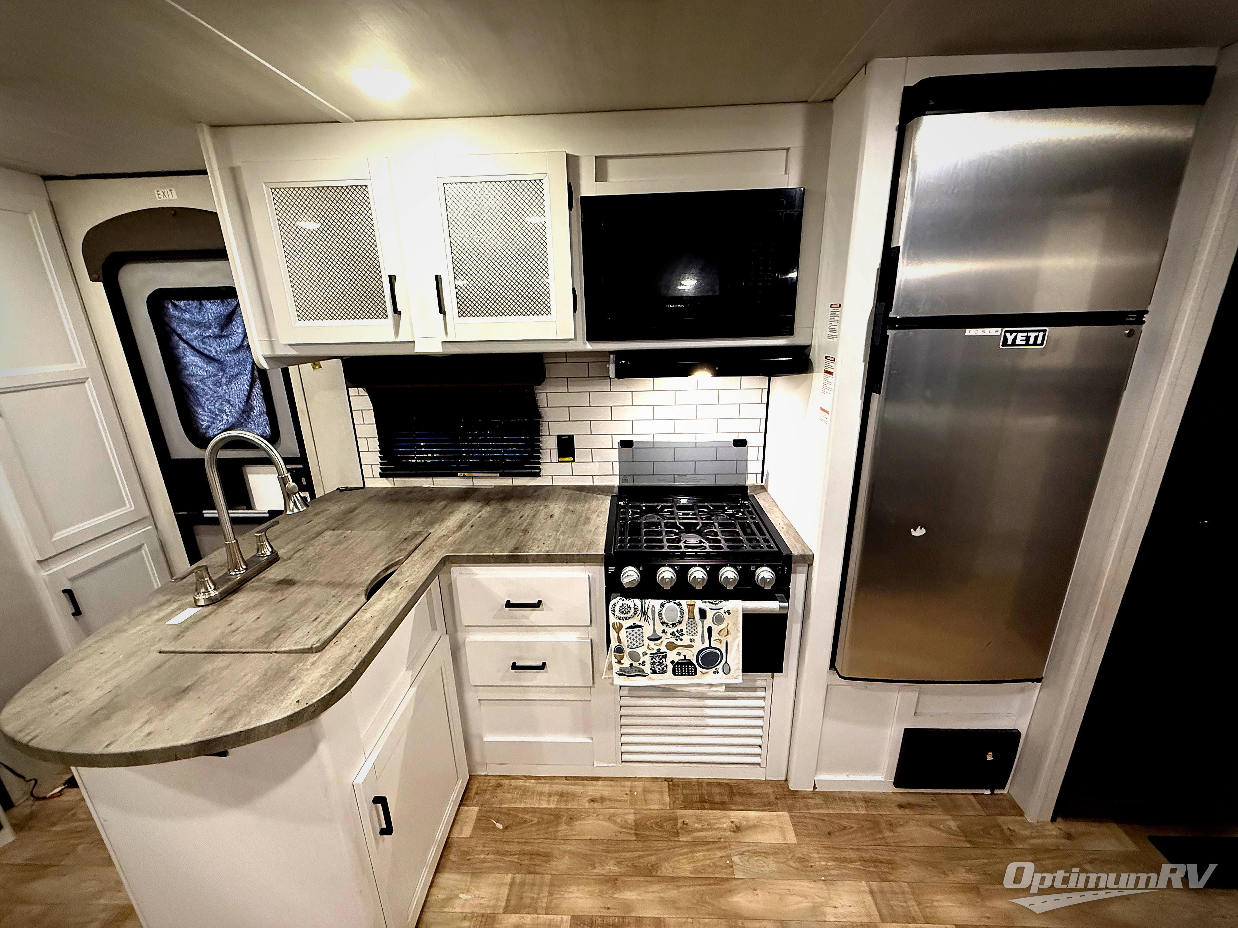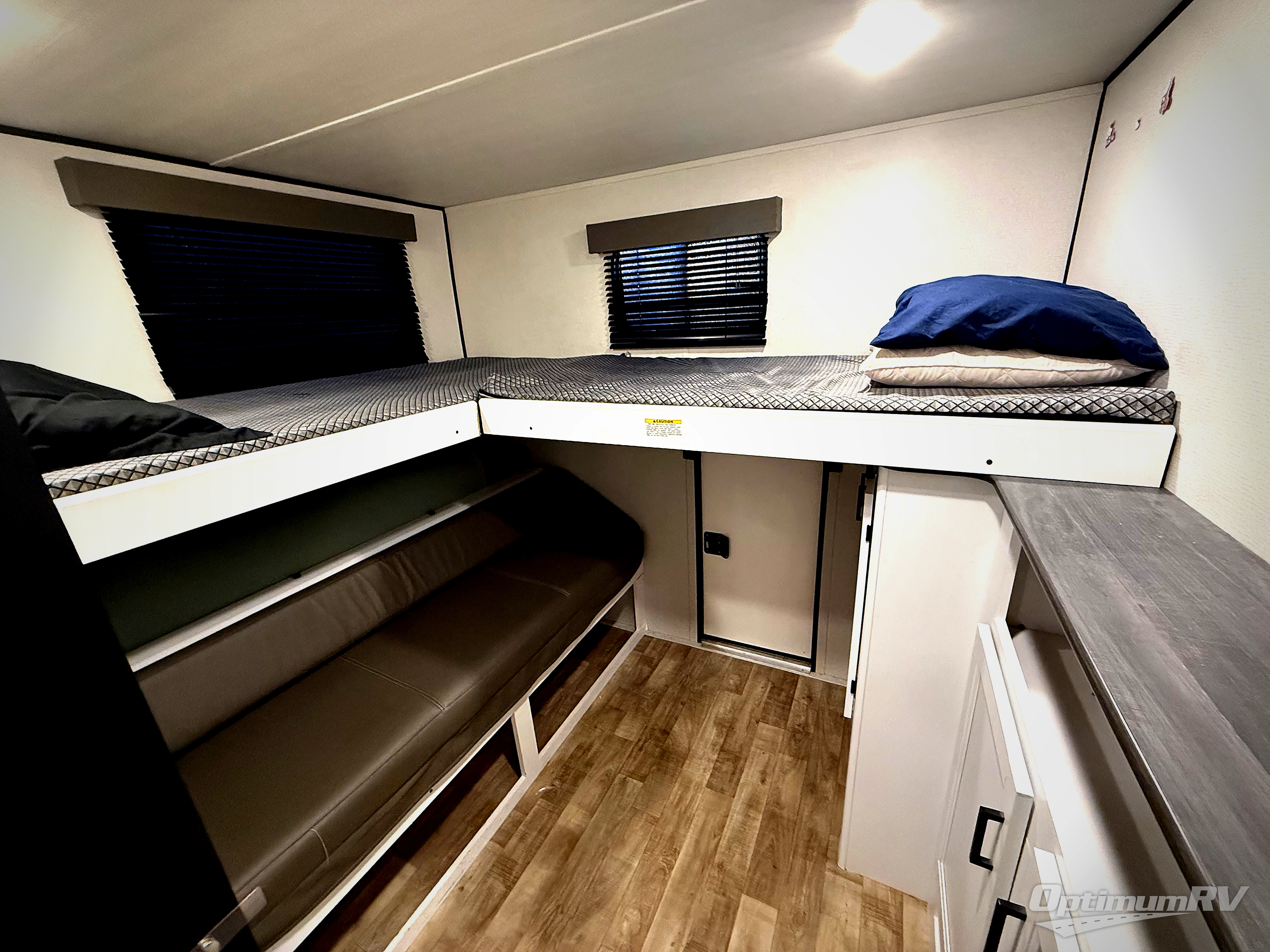 This Hideout travel trailer has an excellent layout, and it offers you a high comfort level with its private bedroom at the front and its private bunkhouse in the back. The bunkhouse contains a queen sofa bed below two flip-up bunks, and there is even a wardrobe and entertainment center in the bunkhouse too. You can swap out the U-shaped dinette for the optional free-standing table with chairs if you wish, and you also have the ability to add an optional tri-fold sleeper sofa next to the dinette on the large slide. The entertainment center in the main living area has a fireplace, and there is a central vacuum in the kitchen to help you clean up the floor after making a mess preparing dinner.