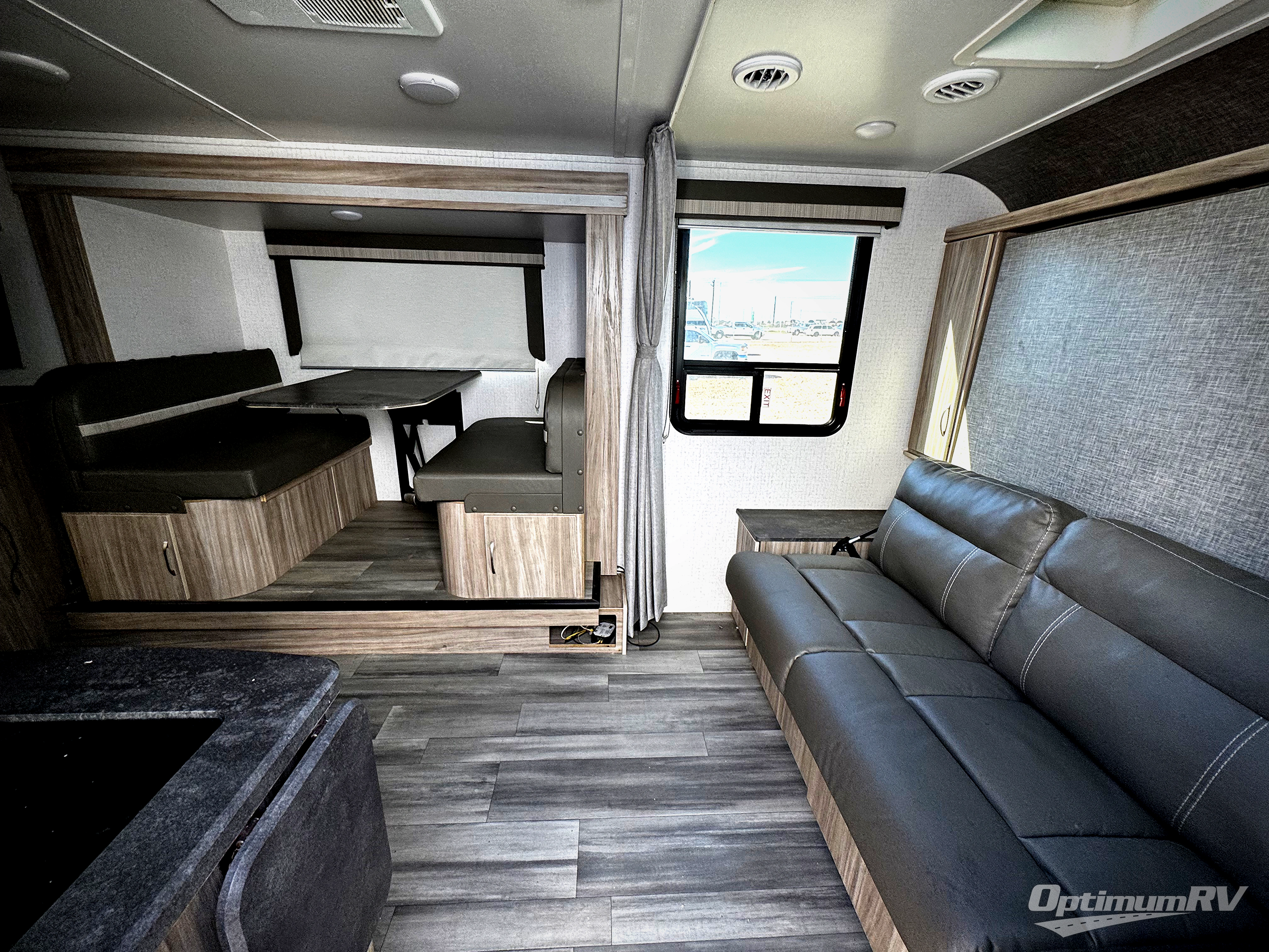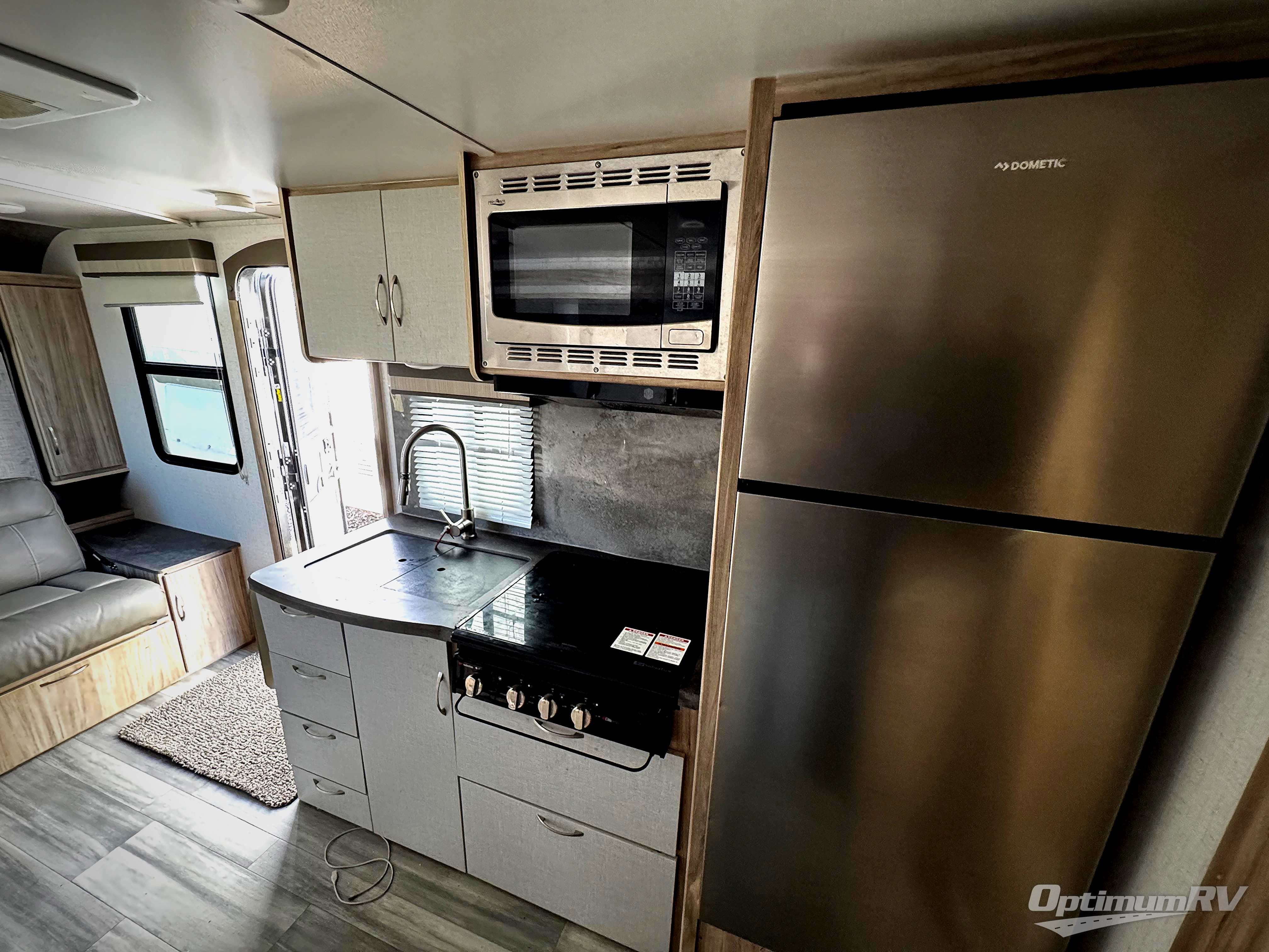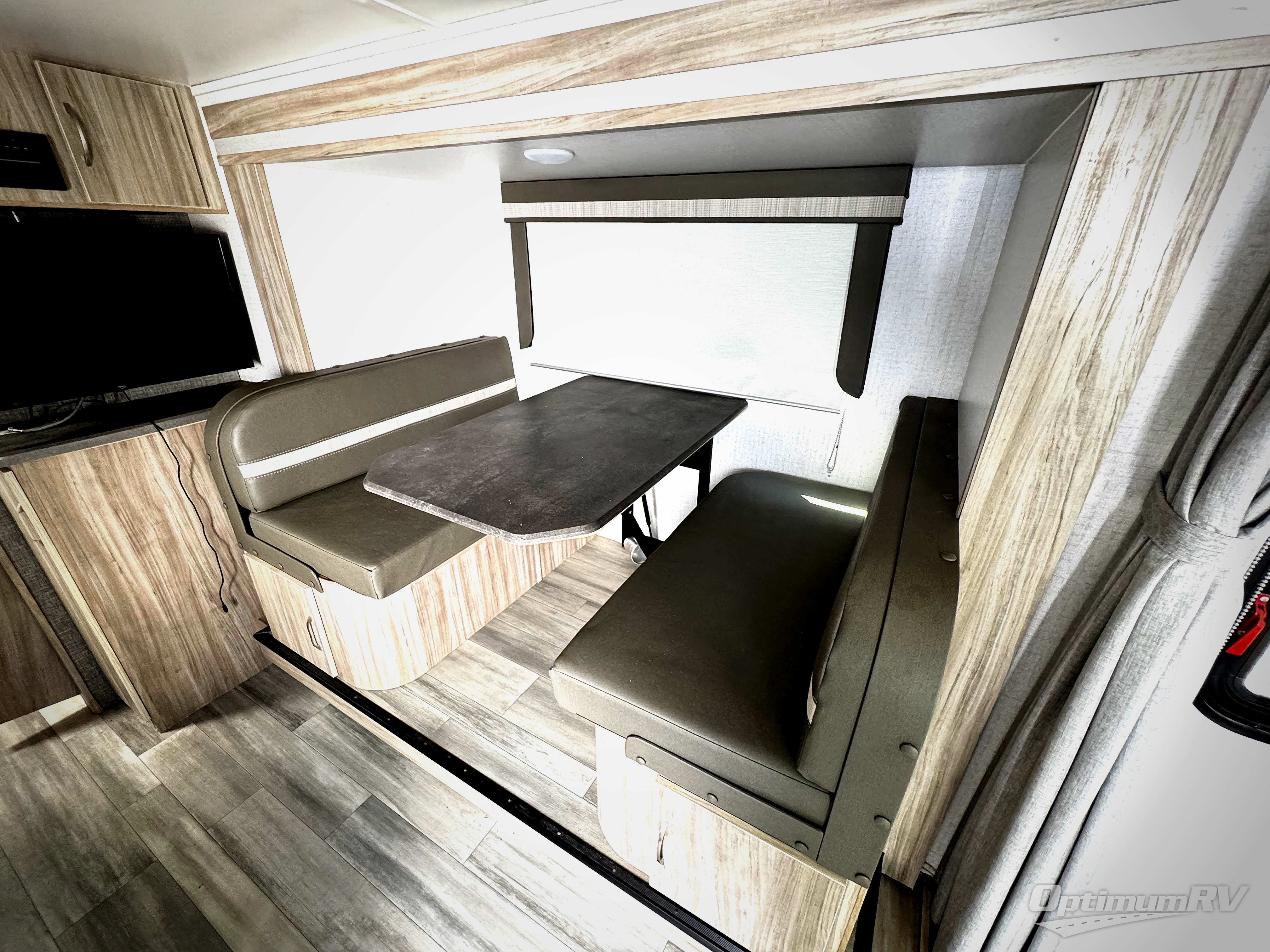 Pack your bags and head to the campground with this travel trailer! You will love all that it has to offer from the full rear bathroom with shower and a wardrobe for your clothes and linens to the front 60" x 74" RV queen bed with a wardrobe on one side, a nightstand on the other, and a privacy curtain to draw at night. The 44" x 72" booth dinette slide is not only a great place to enjoy your meals at or play card games, but it can also be transformed into an extra sleeping space if you want to bring along a guest. When you don't feel like making dinner, you can easily pop in some leftovers or a bag of popcorn into the convection microwave and relax while you watch a movie on the LED TV!