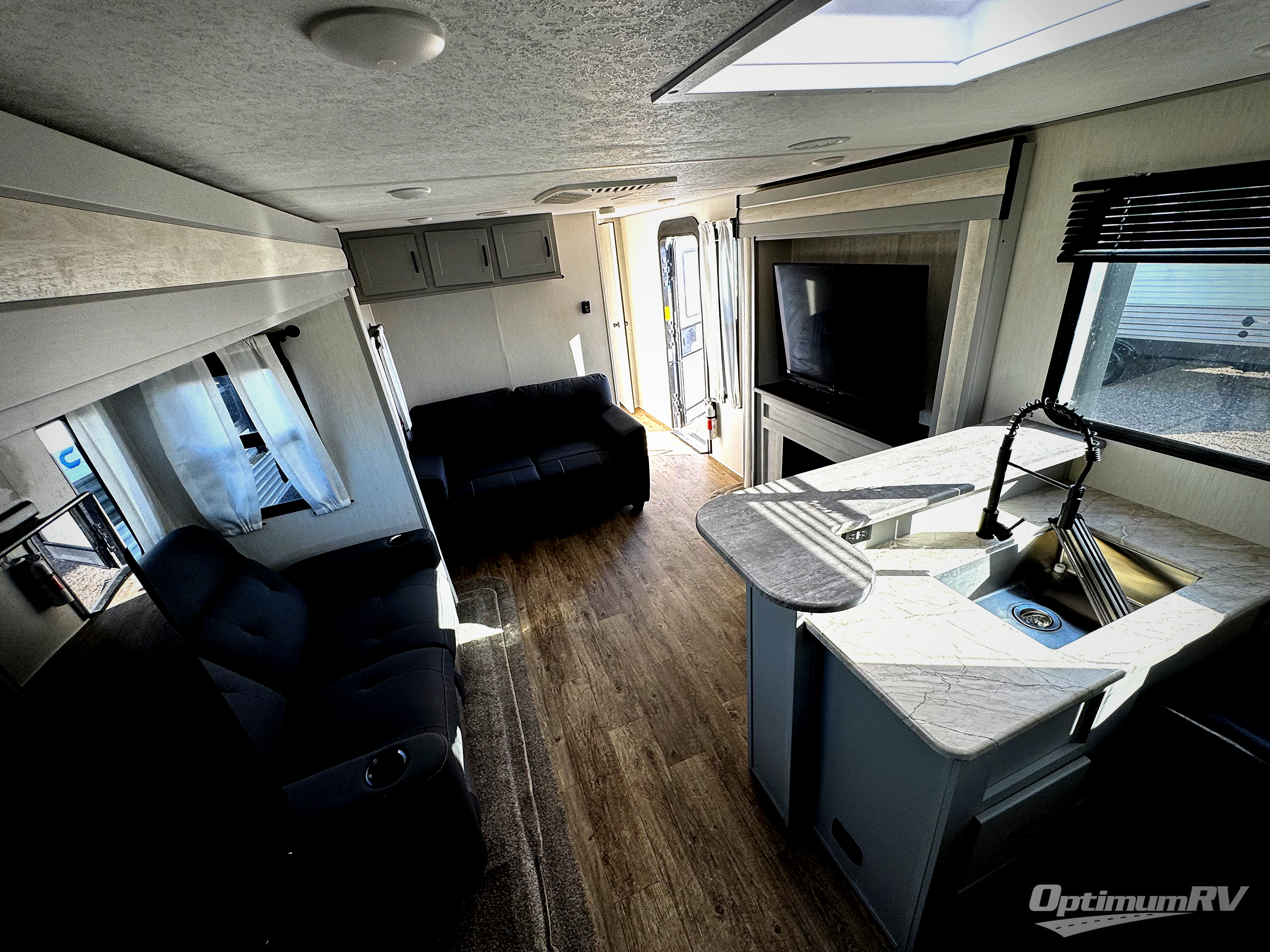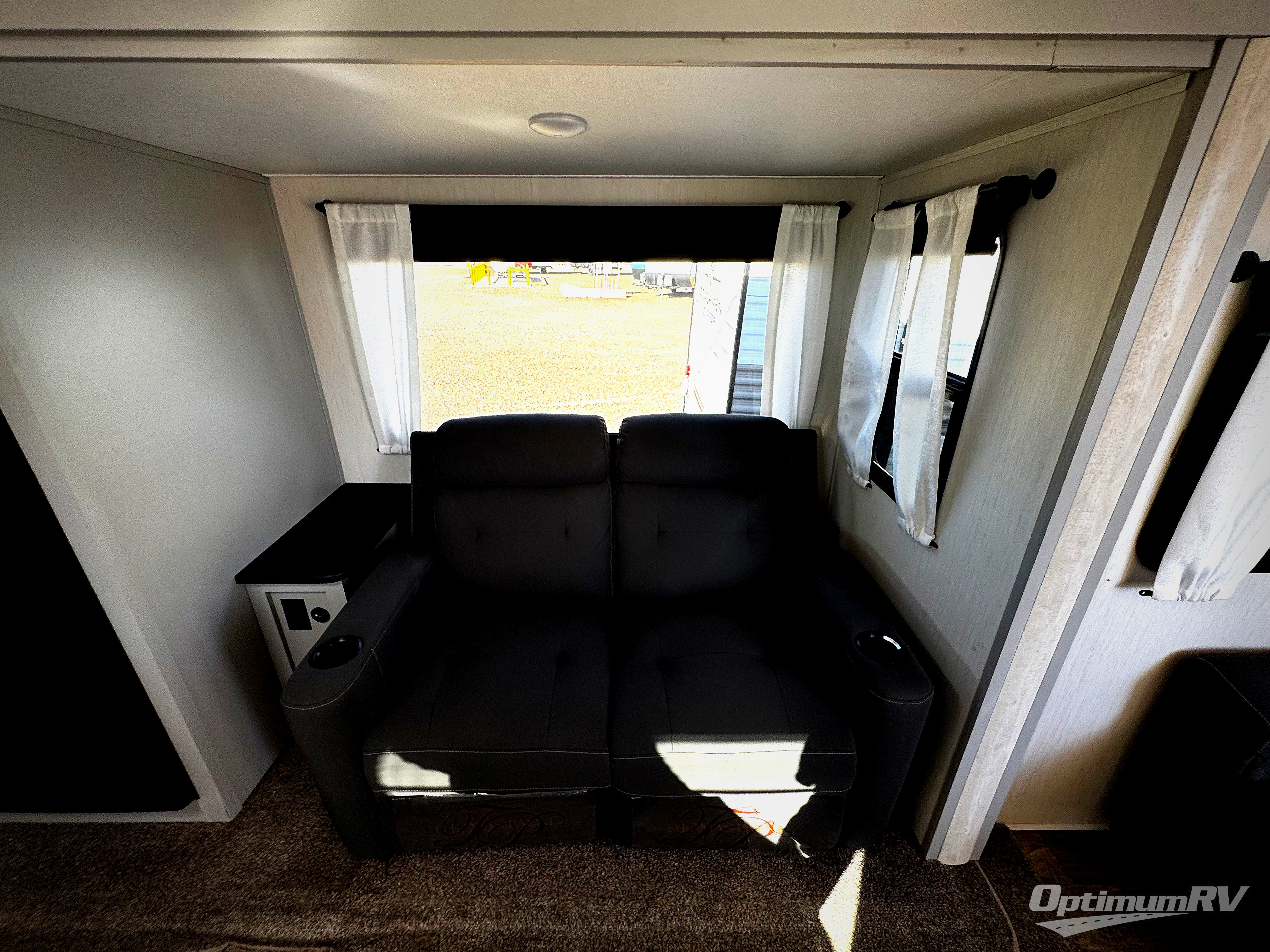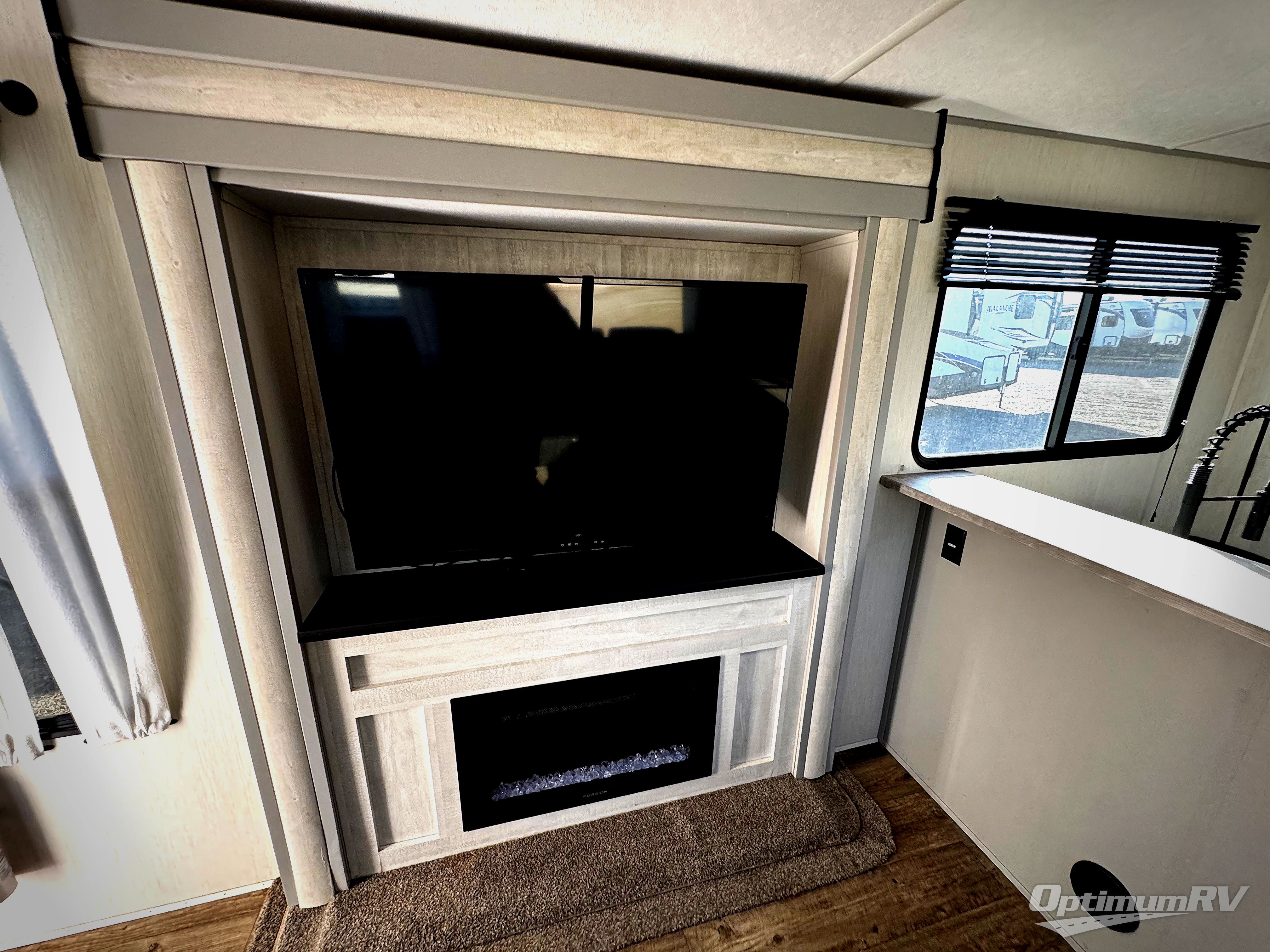 There is no going back to your tent-camping days after touring this travel trailer. The rear kitchen is any chef's dream with its walk-in pantry, residential refrigerator, plus a bar with stools where the kids can enjoy coloring. You will find comfortable seating space on the dual chairs and tri-fold sofa, and the fireplace and 50" TV with storage will feel just like home. The full bath will allow everyone space to clean up each day, and the front private bedroom will be your own oasis away from it all. Here, you will enjoy a slide out queen bed, a dresser where you can add a TV if you choose, plus a front walk-in closet so you can bring along all your favorite outfits!