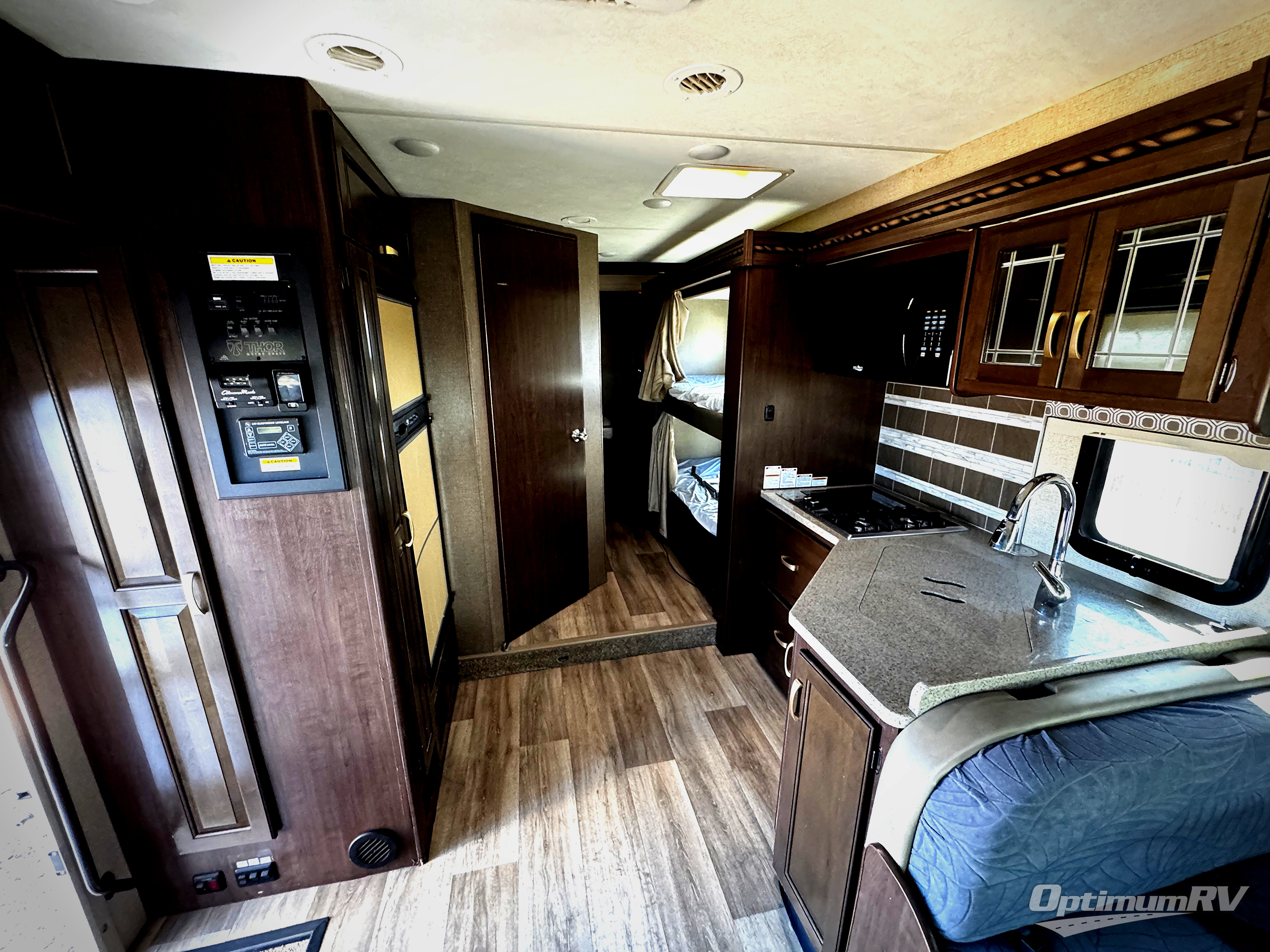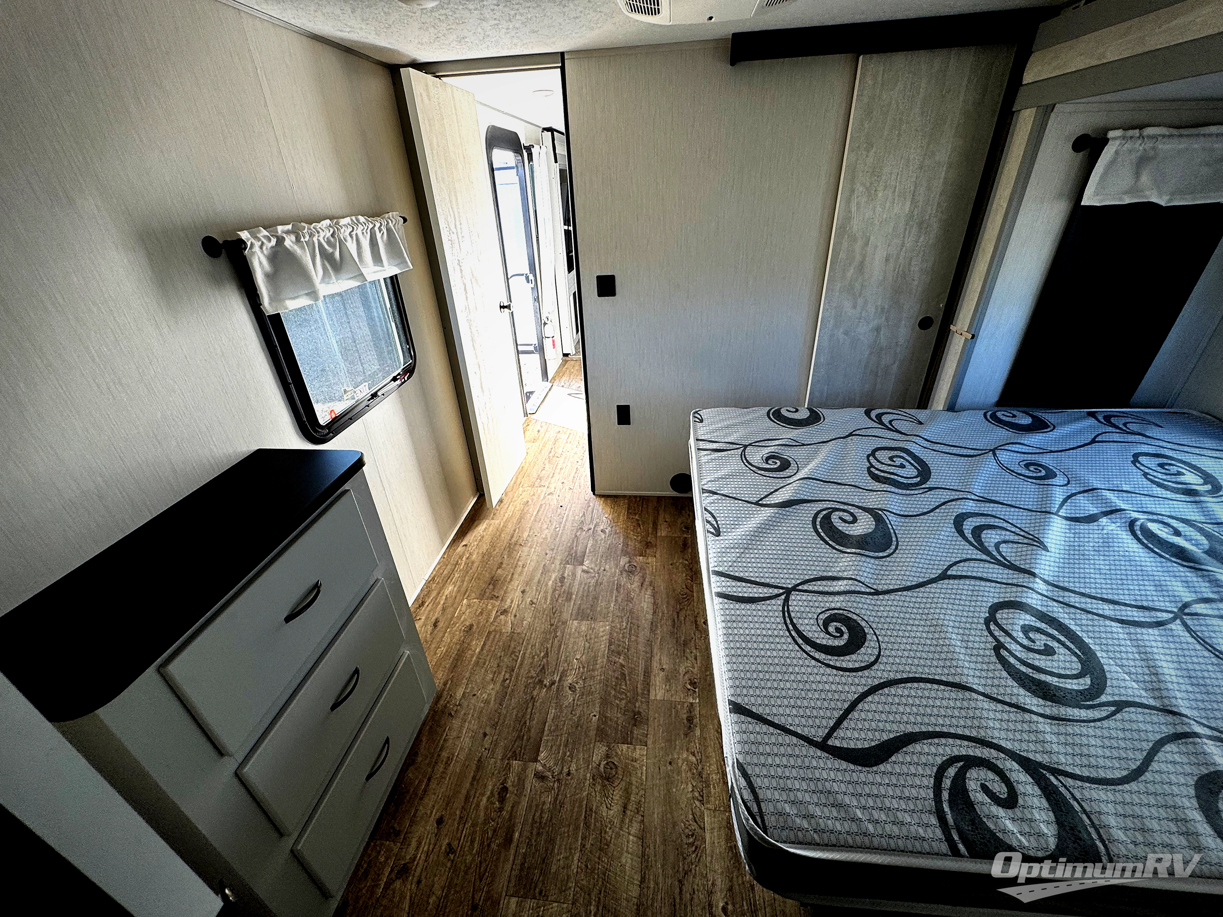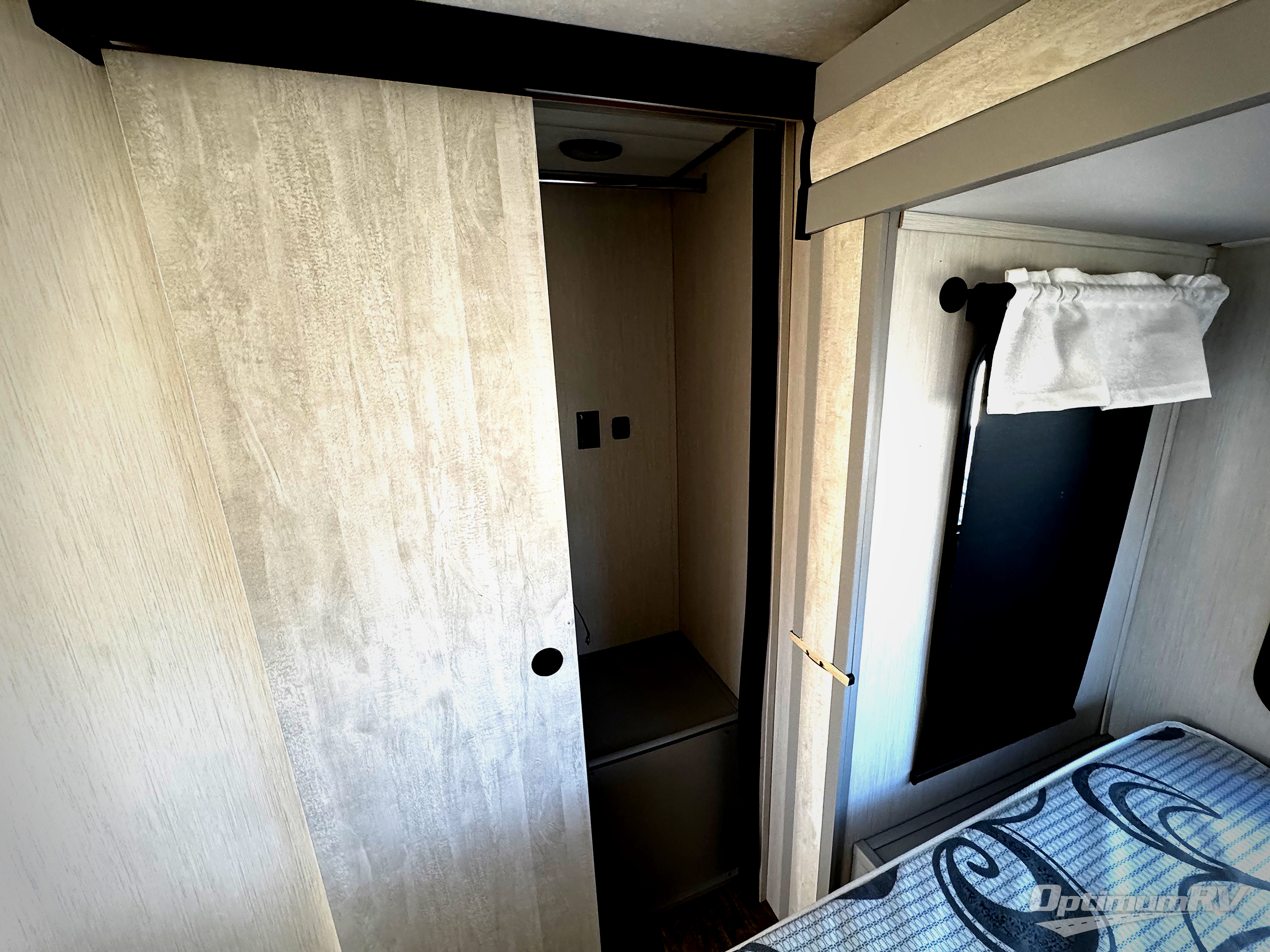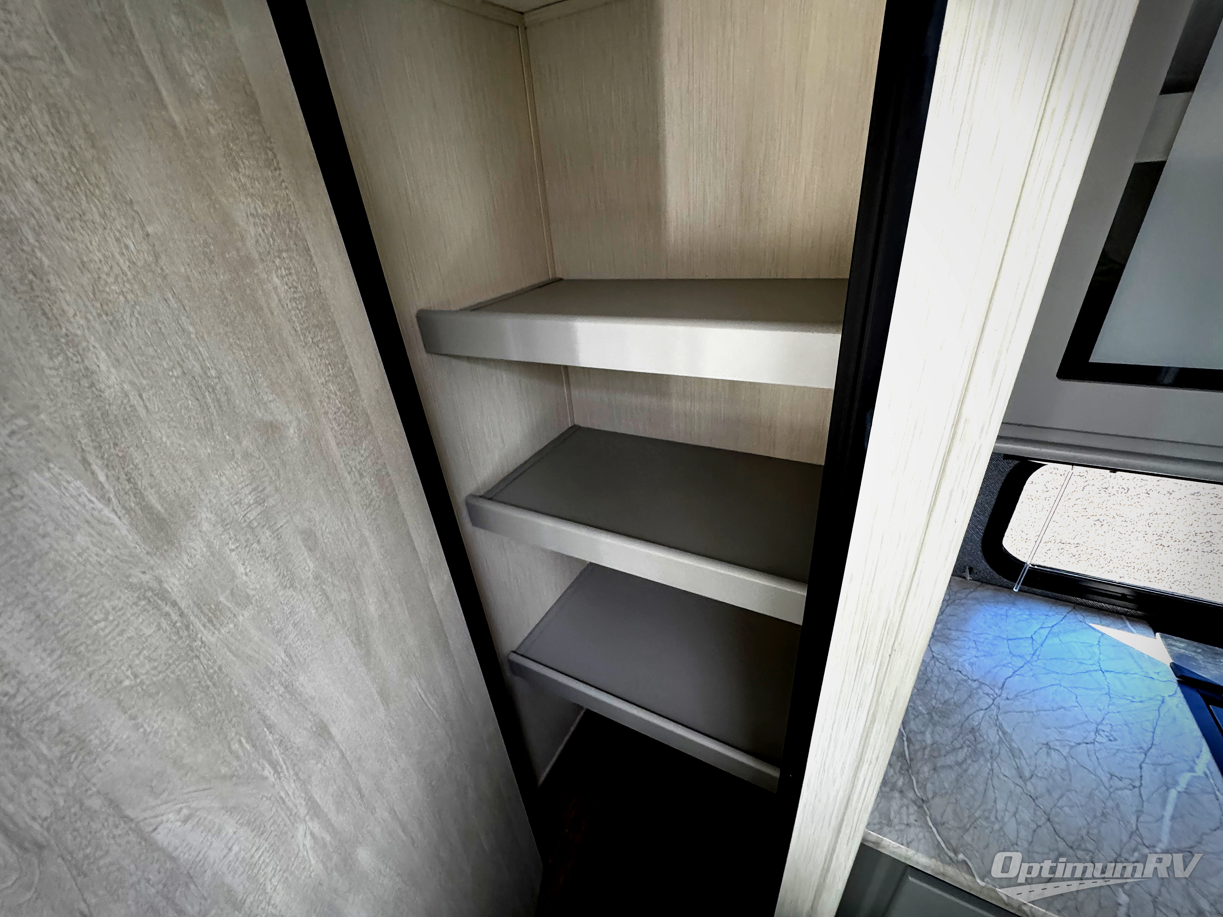 There is no going back to your tent-camping days after touring this travel trailer. The rear kitchen is any chef's dream with its walk-in pantry, residential refrigerator, plus a bar with stools where the kids can enjoy coloring. You will find comfortable seating space on the dual chairs and tri-fold sofa, and the fireplace and 50" TV with storage will feel just like home. The full bath will allow everyone space to clean up each day, and the front private bedroom will be your own oasis away from it all. Here, you will enjoy a slide out queen bed, a dresser where you can add a TV if you choose, plus a front walk-in closet so you can bring along all your favorite outfits!