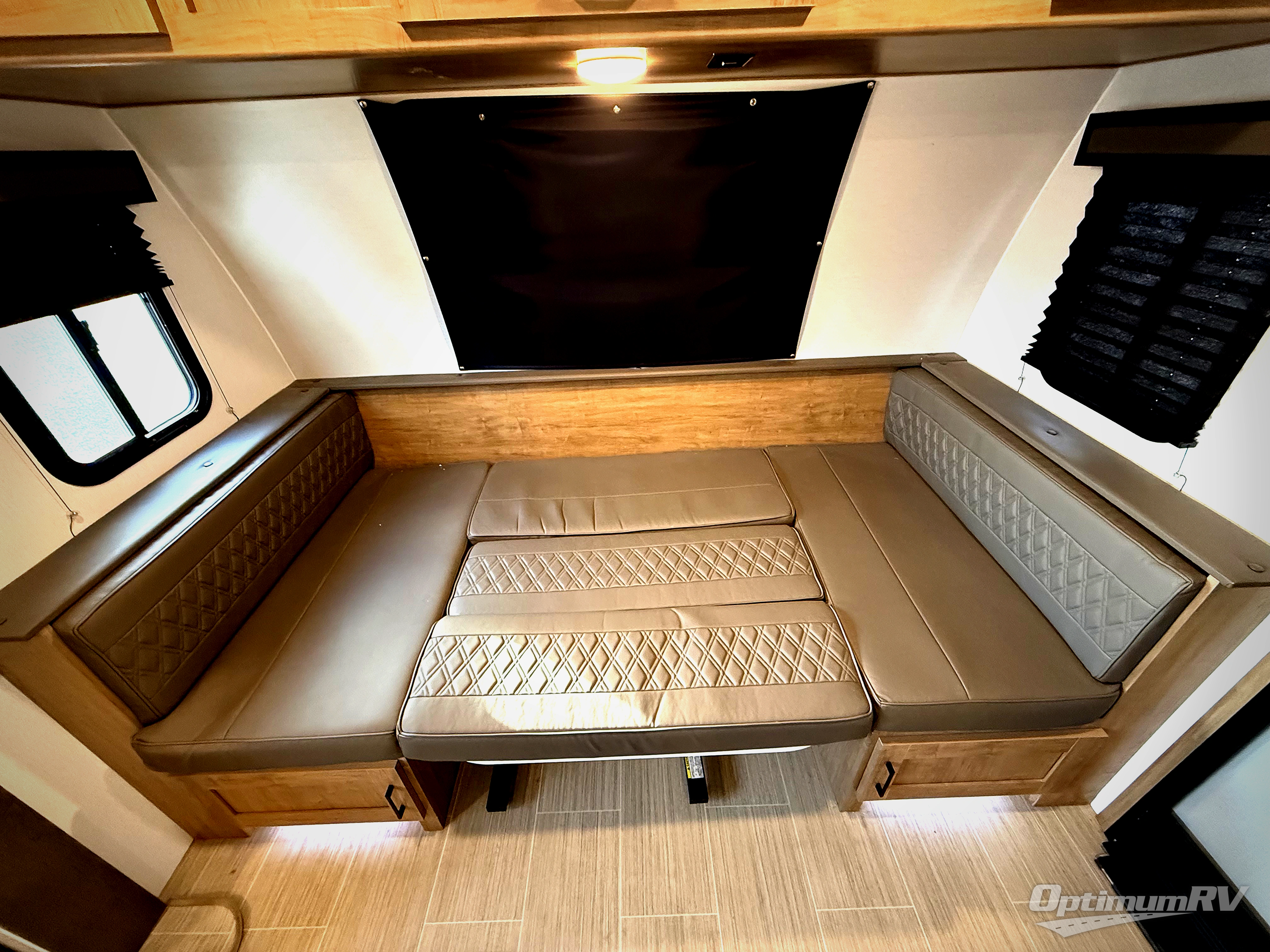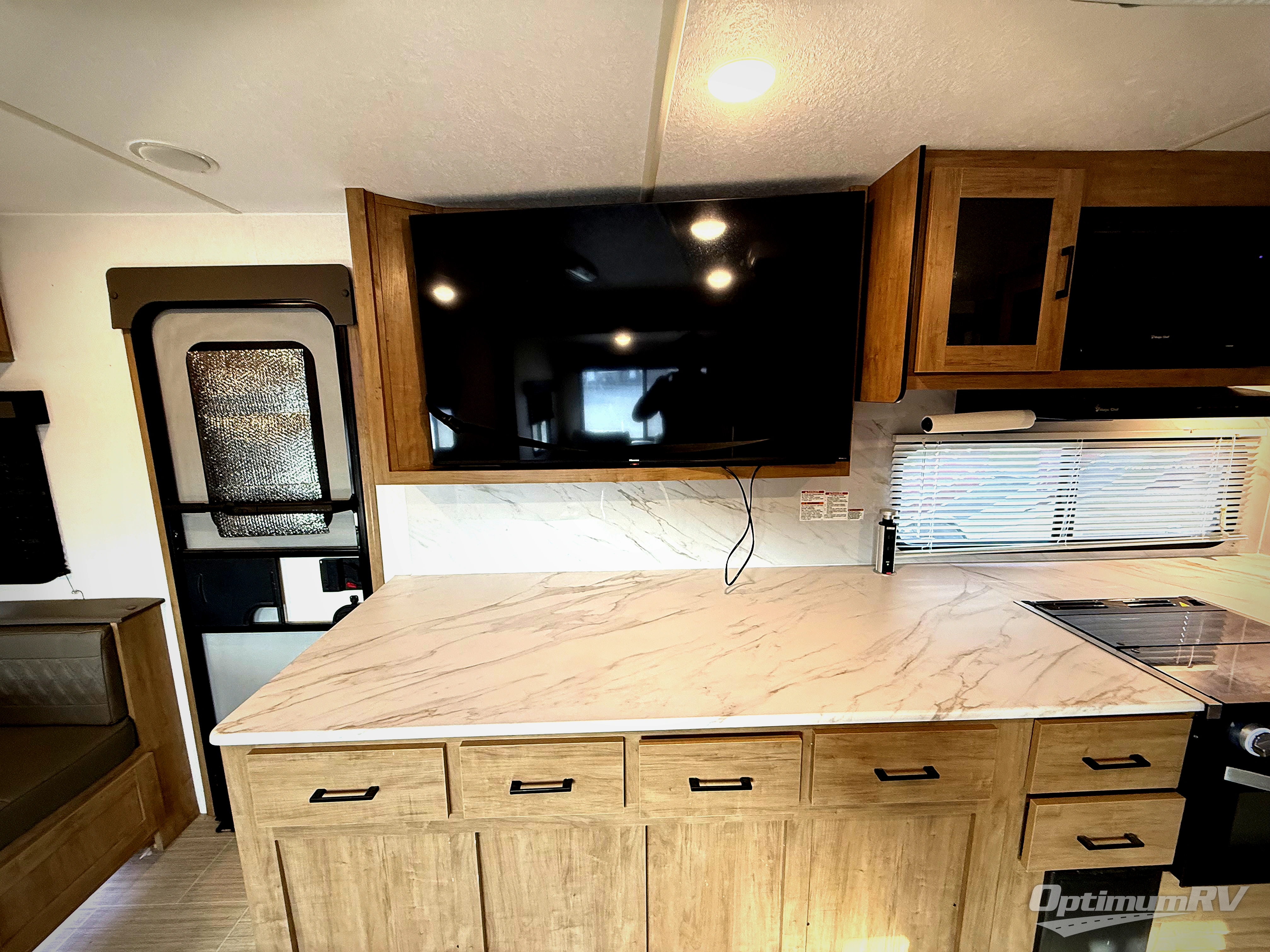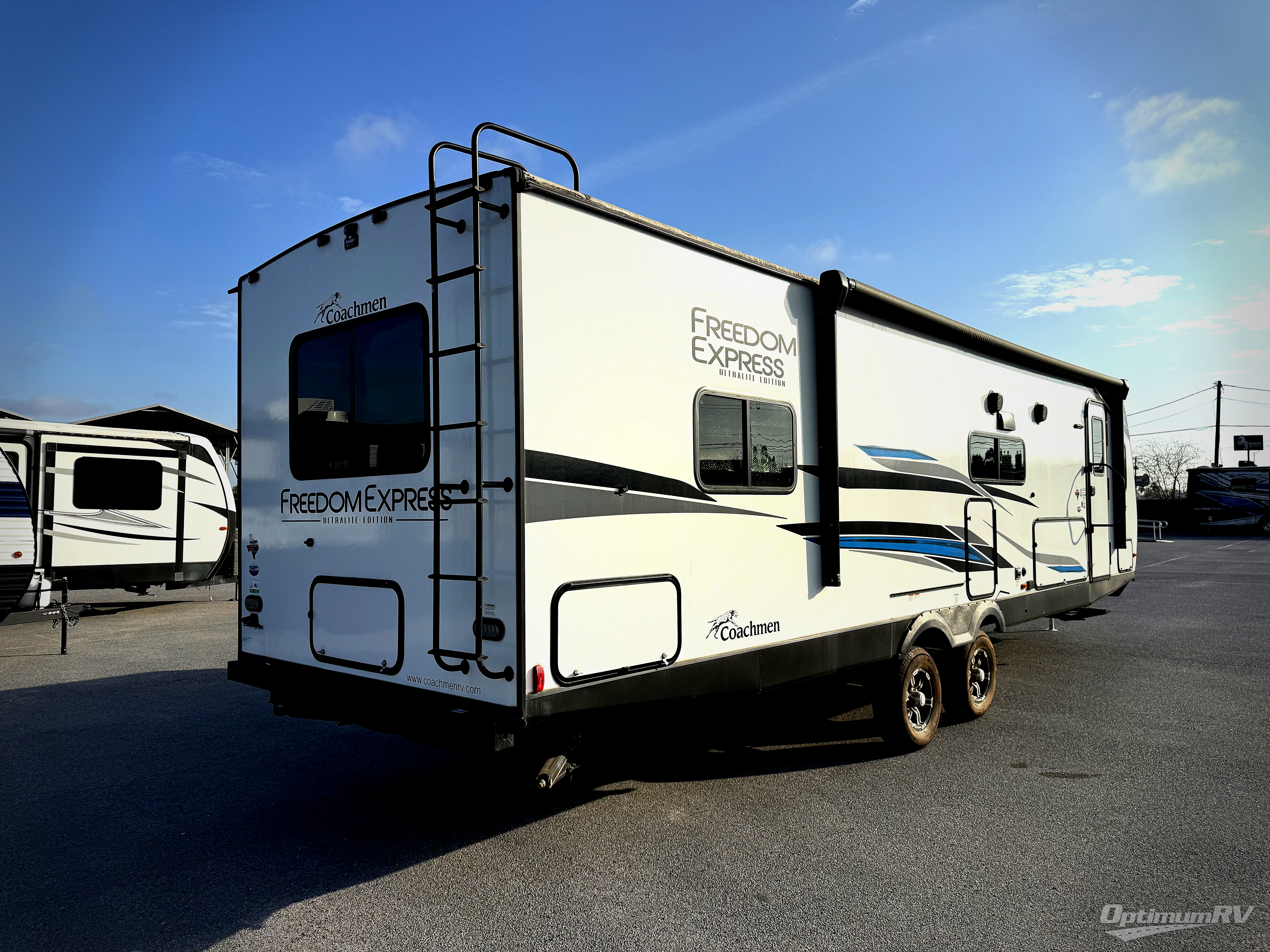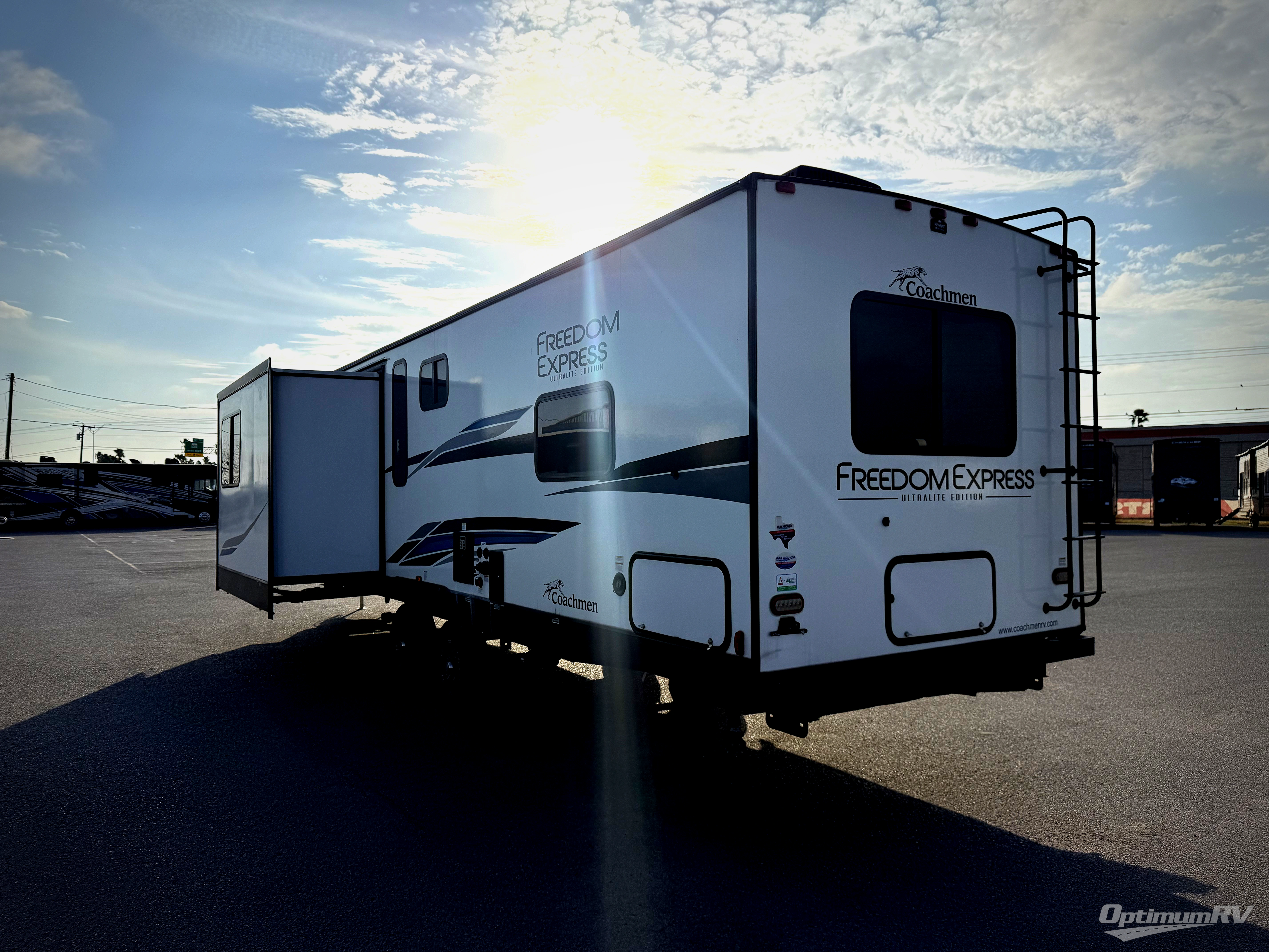 Looking for plenty of storage space in a towable? This Freedom Express Ultra Lite offers you a plenty of it, both inside and out. You will appreciate the spacious combined kitchen and living area featuring a large slide opposite the entry door. Here is where you will enjoy theater seating and your refrigerator and storage. The very front houses a huge 8' U-dinette for meals and game time, and can also serve as extra sleeping space once converted. Opposite the slide above the huge counter with plenty of storage beneath, a flat screen Smart TV. Beyond the kitchen area a spacious walk-through bath that offers space just like at home. There is even a wardrobe that has been prepped for a washer and dryer if you choose to add. A sliding door leads into the rear private master bedroom featuring a queen bed with dual bedside wardrobes and inset bedside shelves, vaulted underbed storage for your things.
