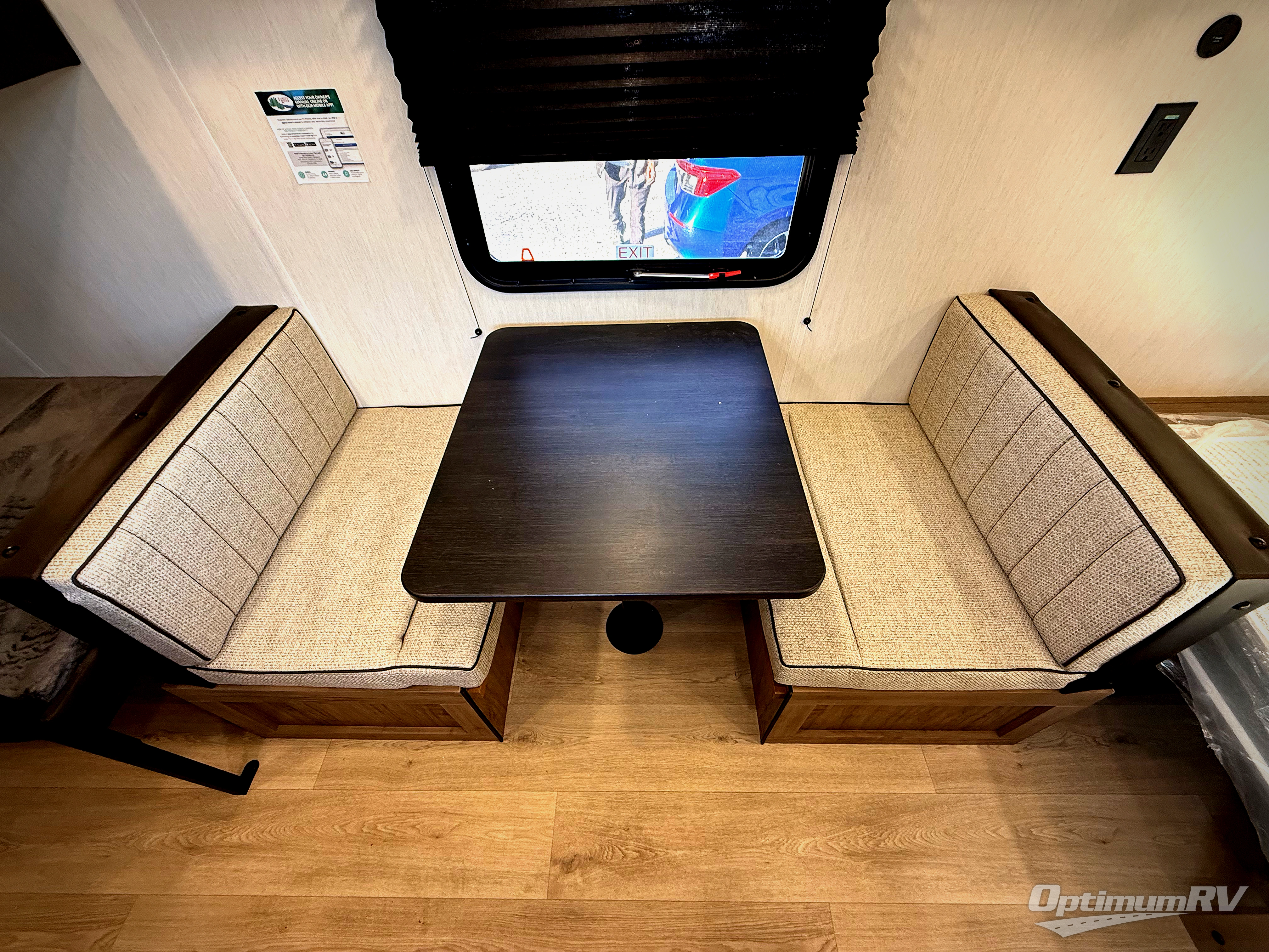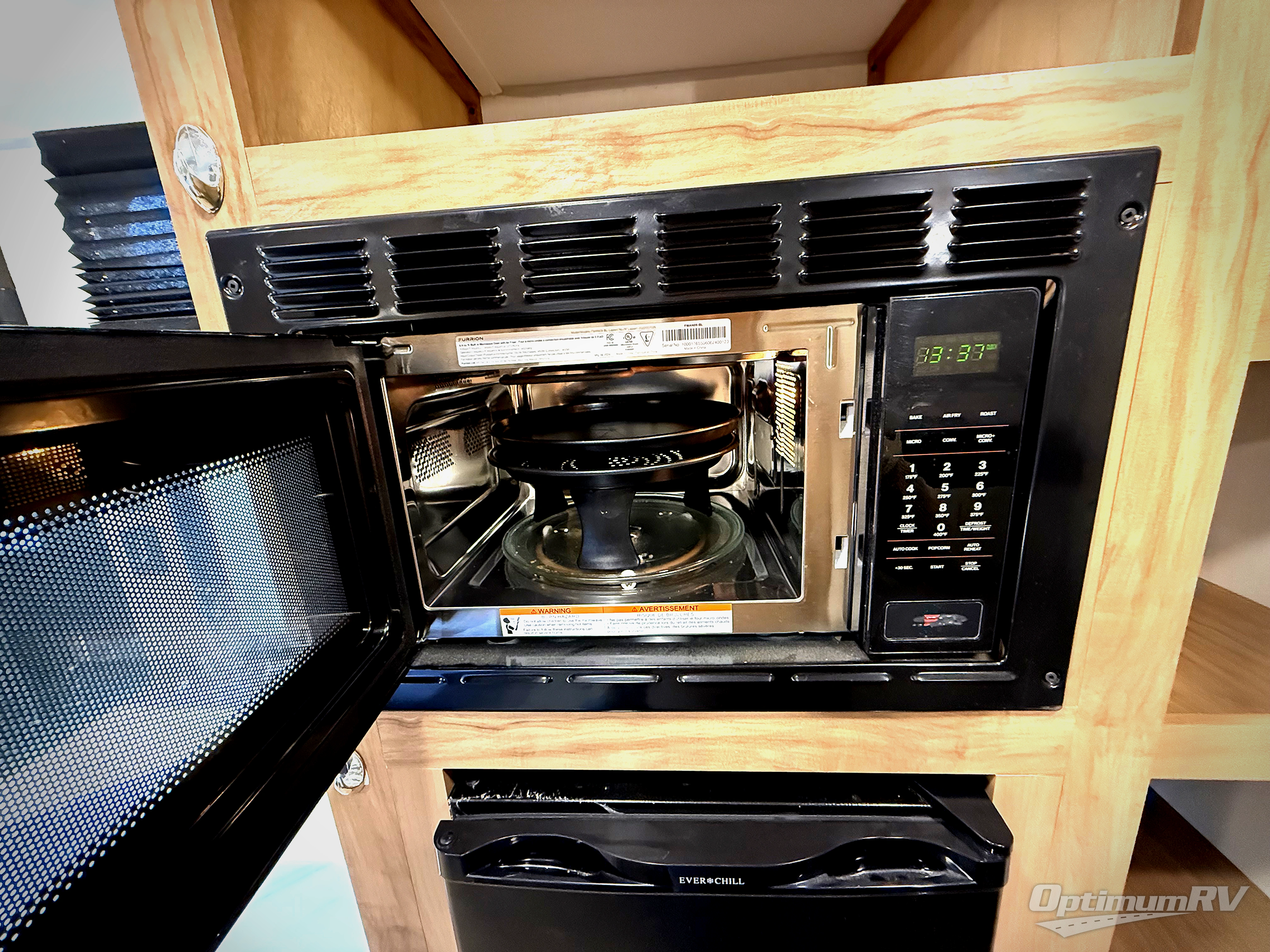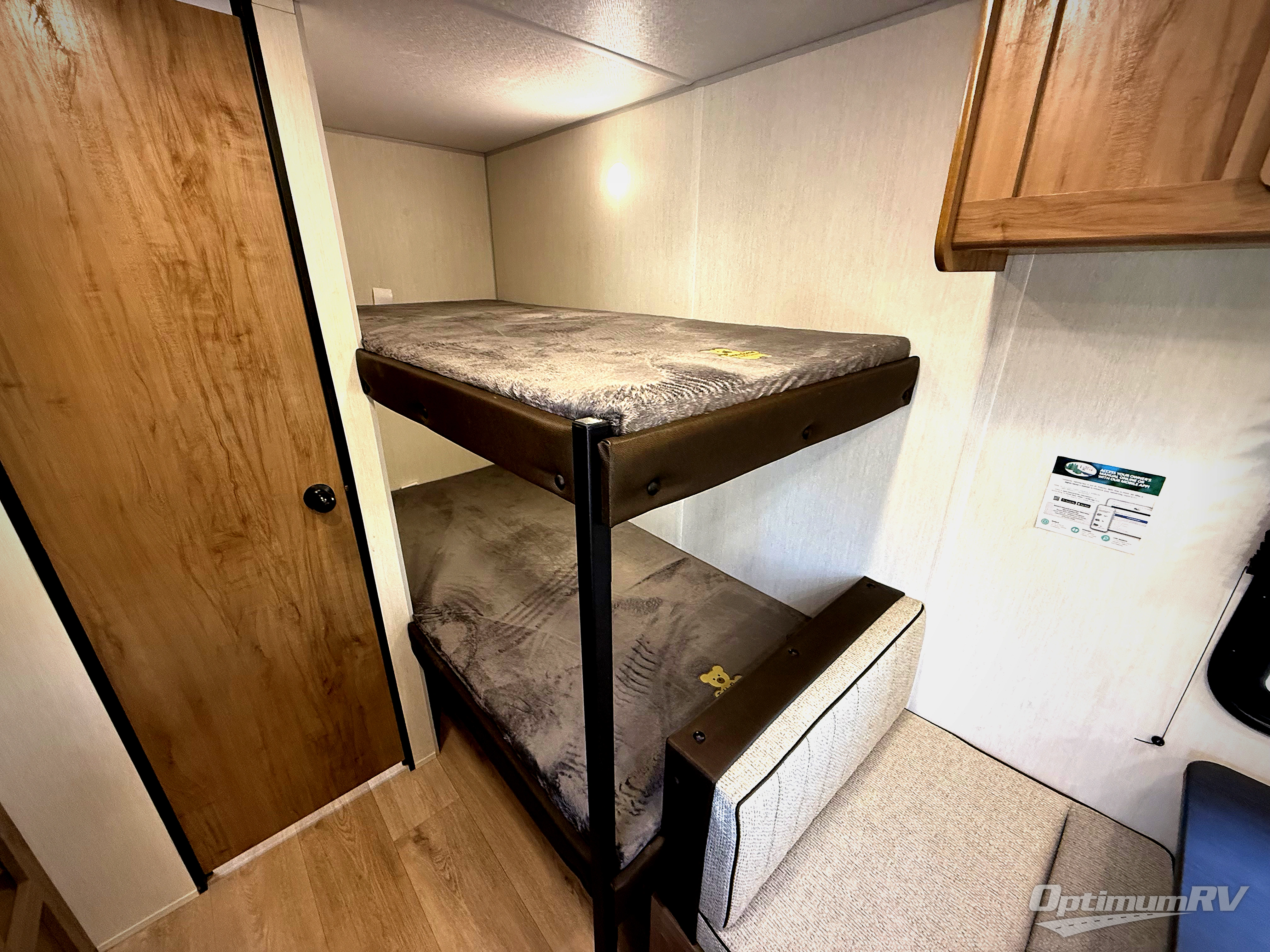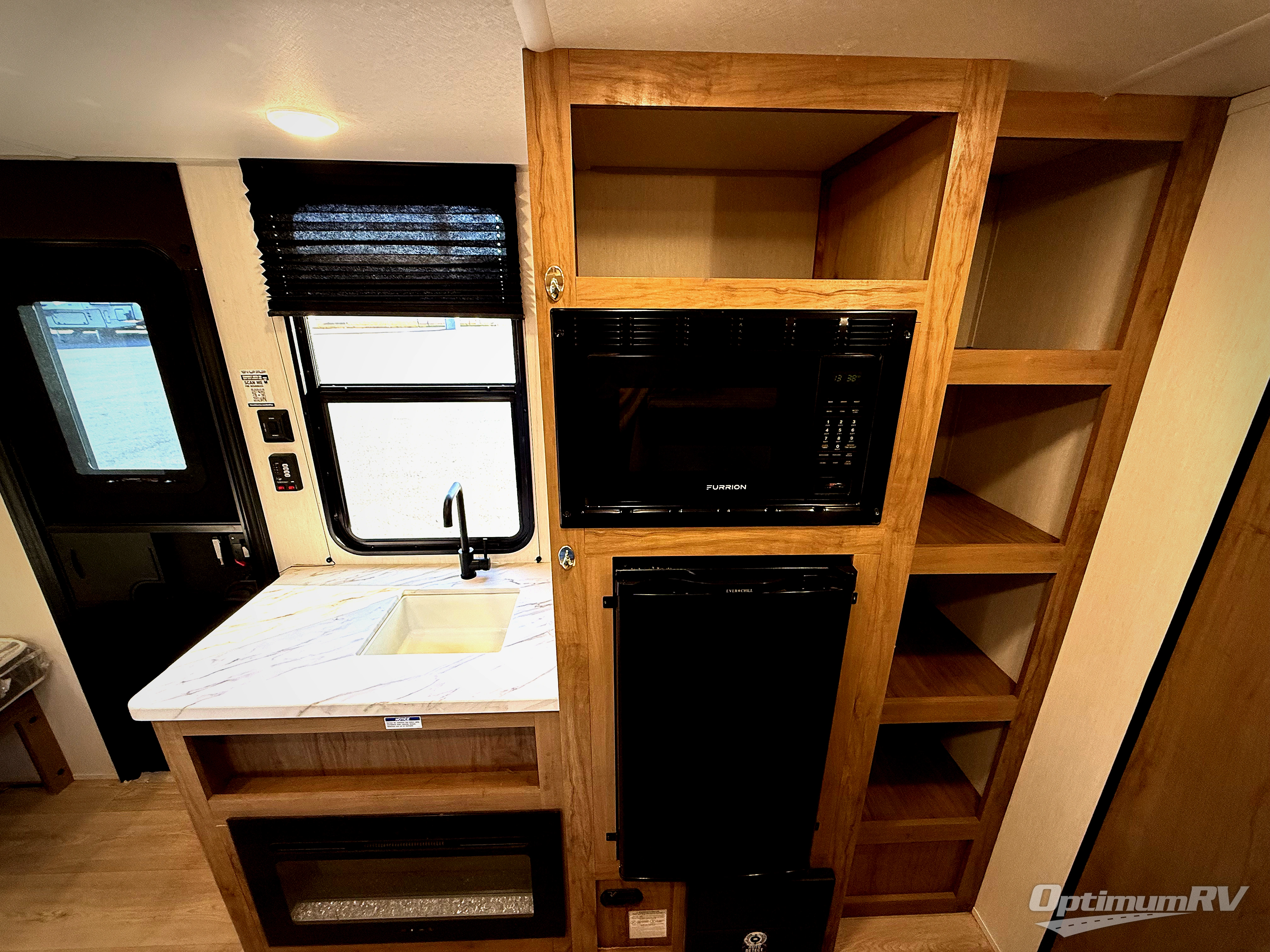 Enjoy family adventures in this all-electric bunk model which features sleeping for four or six depending on size with a queen bed up front, oversized bunks in the rear roadside corner, and you could even convert the booth dinette to sleep more. Inside, you will find ample storage with overhead cabinets and a large shelf above the queen bed, plus four shelves next to the refrigerator and microwave/air fryer that feature decorative storage bins for your things. Use this space for pantry items, towels, or clothing storage. There is even a fireplace below the counter and sink to bring you a bit of heat on those chilly nights. On the outside, you will also find a 12' awning and plenty of outside storage for your camping gear, plus more!