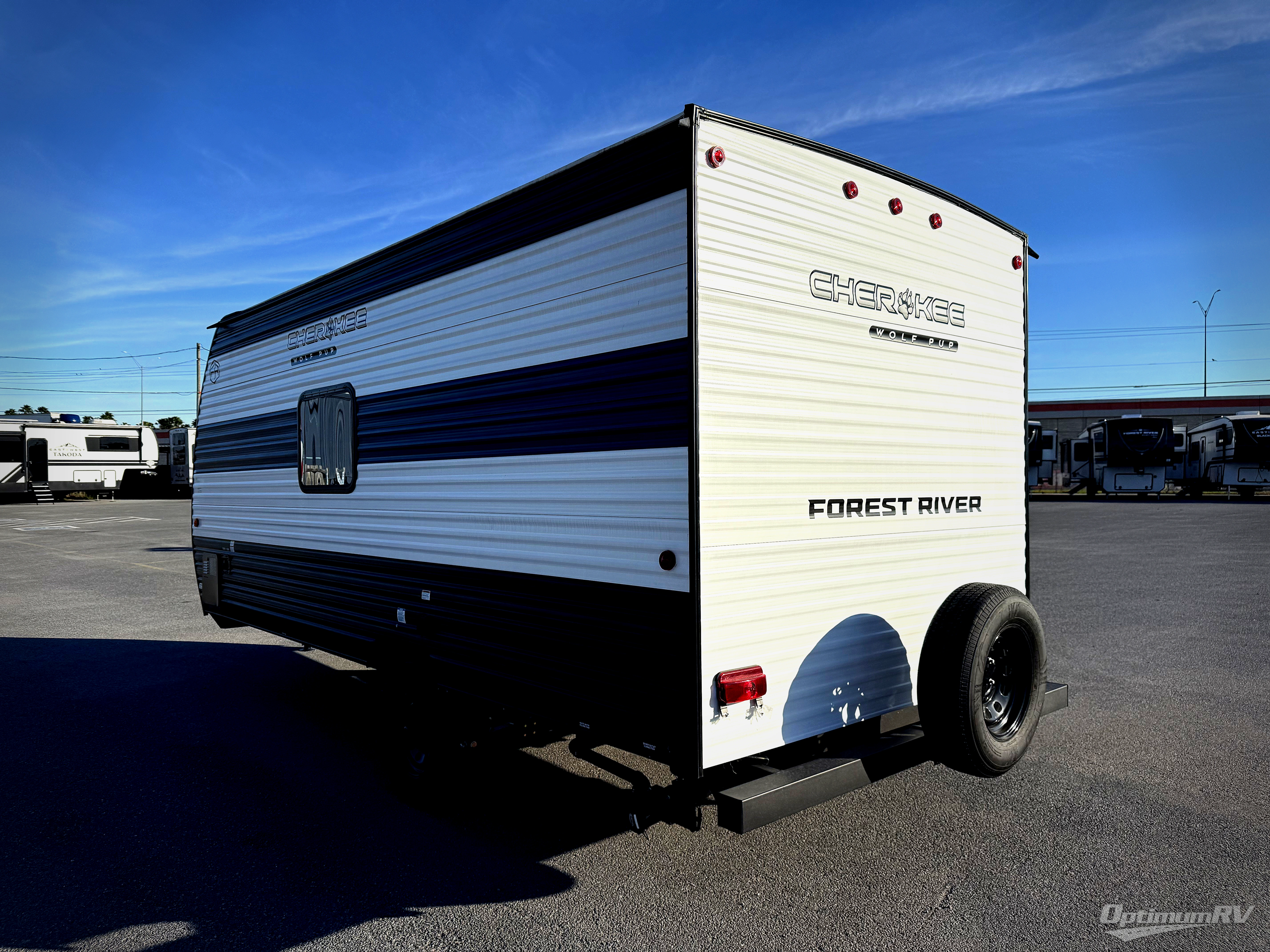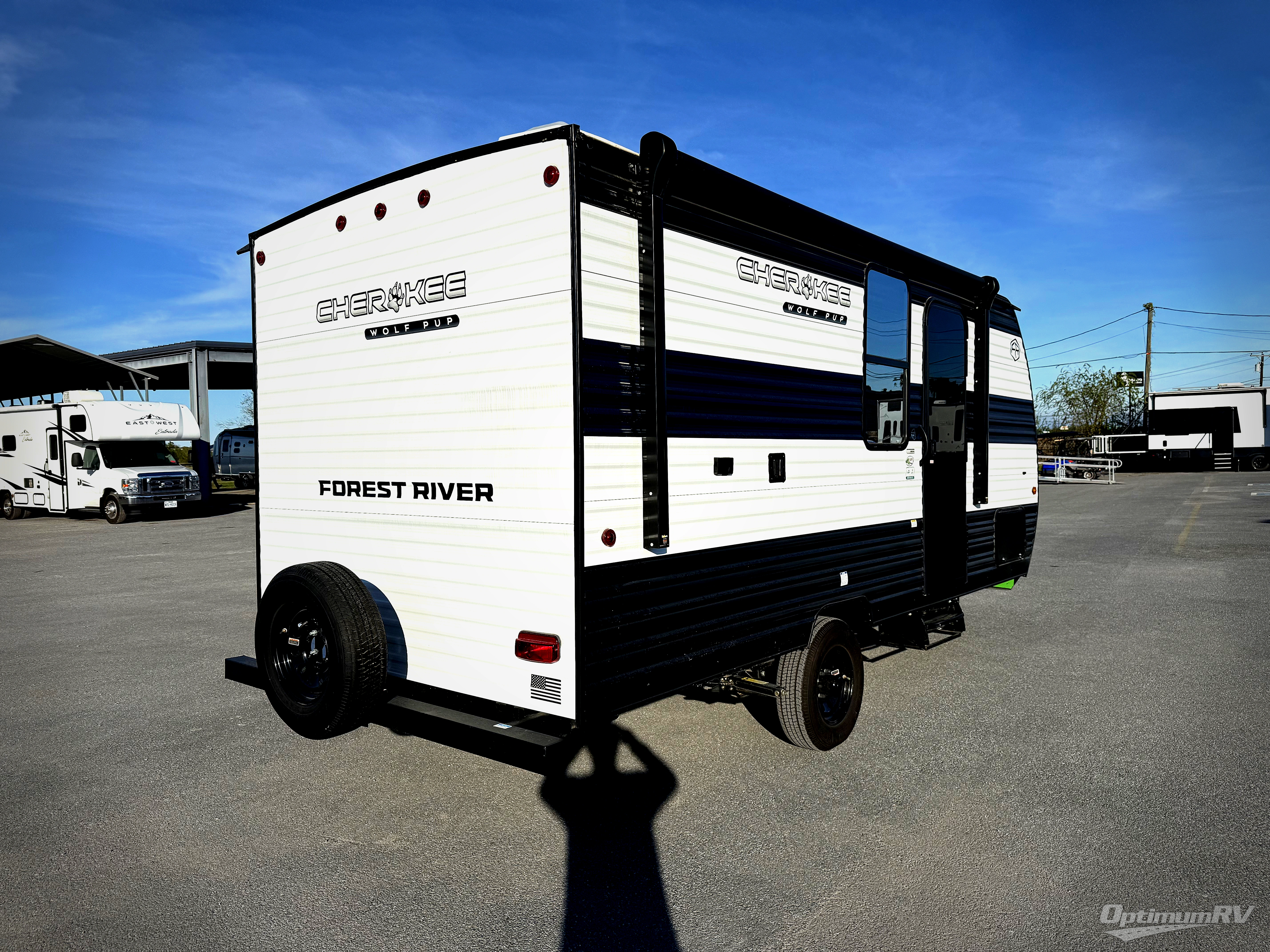 Each one of these Forest River Cherokee Wolf Pup EV travel trailers are ready for adventure when you are! They feature reflective solar bronzed windows, a quick drop jack, a friction hinge entry door, and dual rear jacks. You'll stay comfortable with the 13,500 BTU roof mounted A/C and 5,000 BTU electric fireplace, plus there is a turbo hot water heater so you can take hot showers each day. Inside, night shades and residential style mattresses will provide comfort, and there are storage bins to keep your things organized.